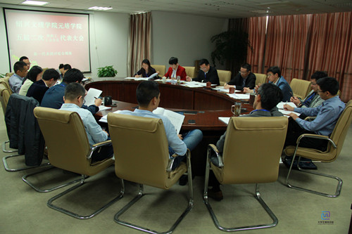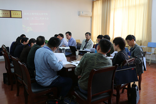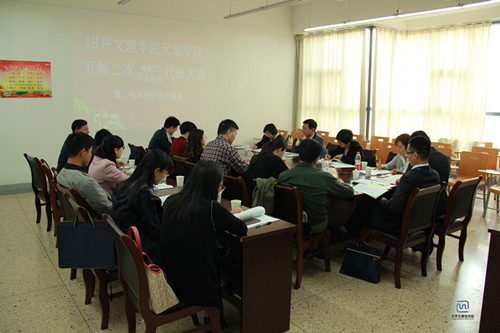 第二代表团在教学楼4幢406会议室讨论和审议学院工作报告等会议文件